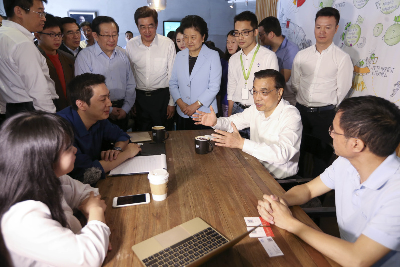 2015年5月7日,李克強來到中關村創(chuàng)業(yè)大街3W咖啡。他坐下來與年輕人邊喝咖啡邊聊創(chuàng)業(yè)。蜂擁圍攏過來的創(chuàng)業(yè)者爭搶著向總理介紹各自的項目。聽到大家各種奇思妙想的創(chuàng)意,總理感嘆道:“這里精彩紛呈,什么想法都有!真正知道社會需求的是大眾,這正是大眾創(chuàng)業(yè)的精髓所在。”(資料圖)