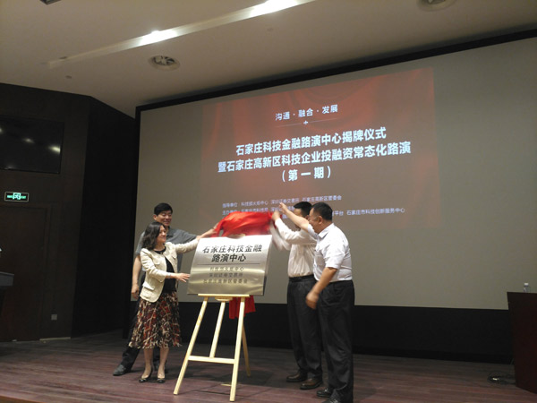 2017年5月24日,由科技部火炬中心、深圳證券交易所、石家莊高新區(qū)管委會(huì)指導(dǎo),石家莊市科技局、深圳證券信息有限公司主辦,石家莊高新區(qū)科技局、中國(guó)高新區(qū)科技金融信息服務(wù)平臺(tái)、石家莊市科技創(chuàng)新服務(wù)中心承辦的“石家莊科技金融路演中心揭牌儀式暨石家莊高新區(qū)科技企業(yè)投融資常態(tài)化路演(期)”活動(dòng)在河北舉辦。石家莊科技金融路演中心將為科技型中小企業(yè)提供專業(yè)化、定制化、特色化路演服務(wù),幫助河北省科技企業(yè)解決融資難題,助力京津冀協(xié)同發(fā)展。