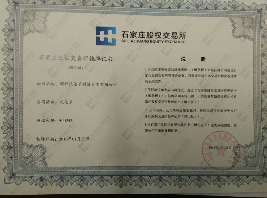 在2016年1月25日,邯鄲高科園區(qū)企業(yè)邯鄲沃倫多科技開發(fā)有限公司在石家莊股權(quán)交易所成功掛牌,成為邯鄲市在“石交所孵化板”成功掛牌的屈指可數(shù)的科技型創(chuàng)業(yè)企業(yè)。掛牌證書于近日下發(fā),標(biāo)志著邯鄲沃倫多科技開發(fā)有限公司的發(fā)展進(jìn)入了一個(gè)新的里程碑。