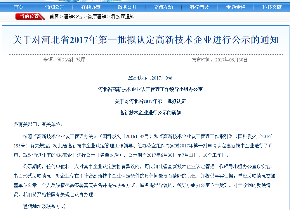 近日,河北省科技廳公示了2017年批擬認定高新技術企業,園區企業河北中創廣電科技有限公司榮登榜單。