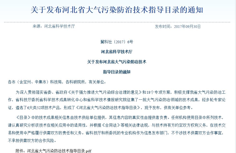 近日,河北省科學(xué)技術(shù)廳委托省科學(xué)技術(shù)成果轉(zhuǎn)化中心和省科學(xué)技術(shù)情報研究院征集了一批大氣污染防治領(lǐng)域的技術(shù)成果,經(jīng)多輪專家論證,遴選了6大類52項技術(shù)產(chǎn)品,形成了《河北省大氣污染防治技術(shù)指導(dǎo)目錄》,園區(qū)企業(yè)河北唯沃環(huán)境工程科技有限公司榮幸入選。